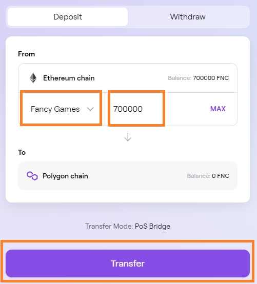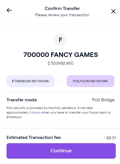 Select Fancy Games from the Drop Down, and enter the amount you wish to transfer over to Polygon. Then click Transfer