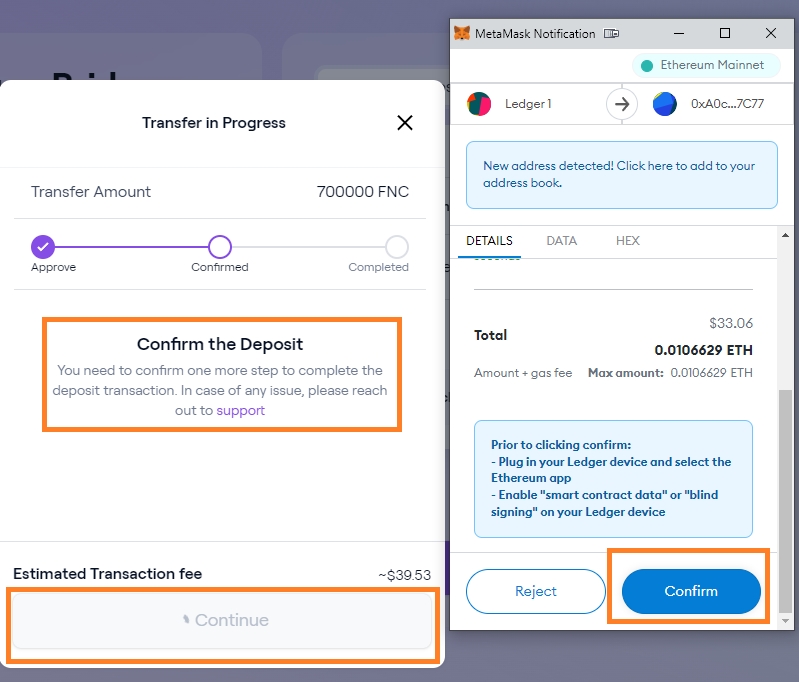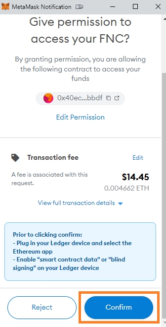 Confirm the transaction in wallet to approve FNC